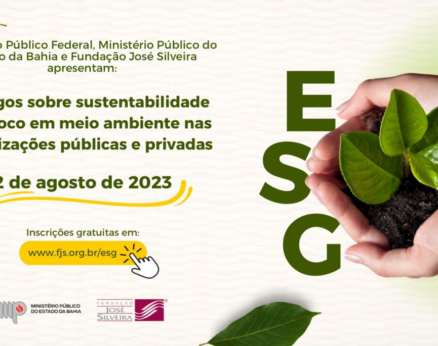 Os Ministérios Públicos Federal (MPF) e do Estado da Bahia (MPBA) em parceria com a Fundação José Silveira (FJS) promovem, em 22 de agosto, o evento ESG: Diálogos sobre Sustentabilidade com foco em Meio Ambiente nas Organizações Públicas e Privadas. O evento será das 9h às 17h30, no auditório da sede do MPF/BA em Salvador, as inscrições são gratuitas e devem ser feitas pela página do evento (https://fjs.org.br/esg/).